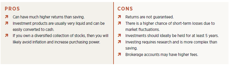 Overall, saving is better if you need the money within the next few years. Investing is more suitable if you don’t need the money for at least 5 years and are comfortable with risk. Regardless of your choice, it is good practice to keep enough money in your checking account to cover a month’s worth of bills and maintain 3–6 months of expenses in your savings for emergencies. After that, you should prioritize saving for retirement.